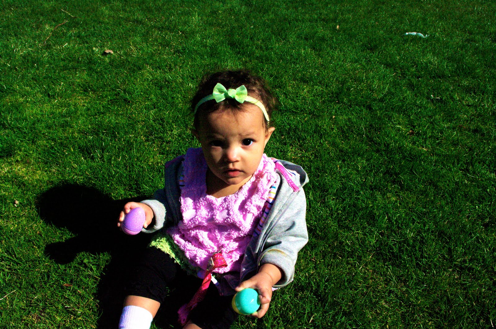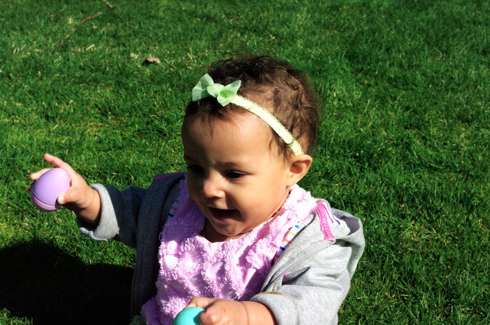 There were eggs all over and it was all sectioned off by age. The largest group was hers, so we snuck down to the oldest group because there were virtually no kids in that area. I set her down in the grass and she picked up one egg for each hand. And that was all. She game me a look that said, "Ok, mom I have al I need" and proceeded to play with those two eggs for about an hour! I love watching her and learning something! Our lesson today was take what you need. She came up with that all on her own :)